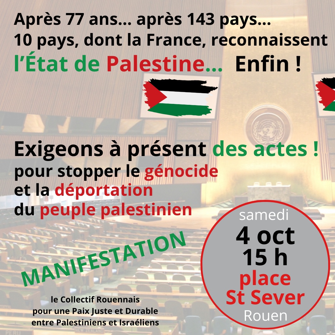 Après la reconnaissance à l'ONU et en soutien à la Flotille vers Gaza menacée, le Collectif pour une Paix Juste et Durable entre Palestiniens et Israéliens appelle à une manifestation le 4 octobre