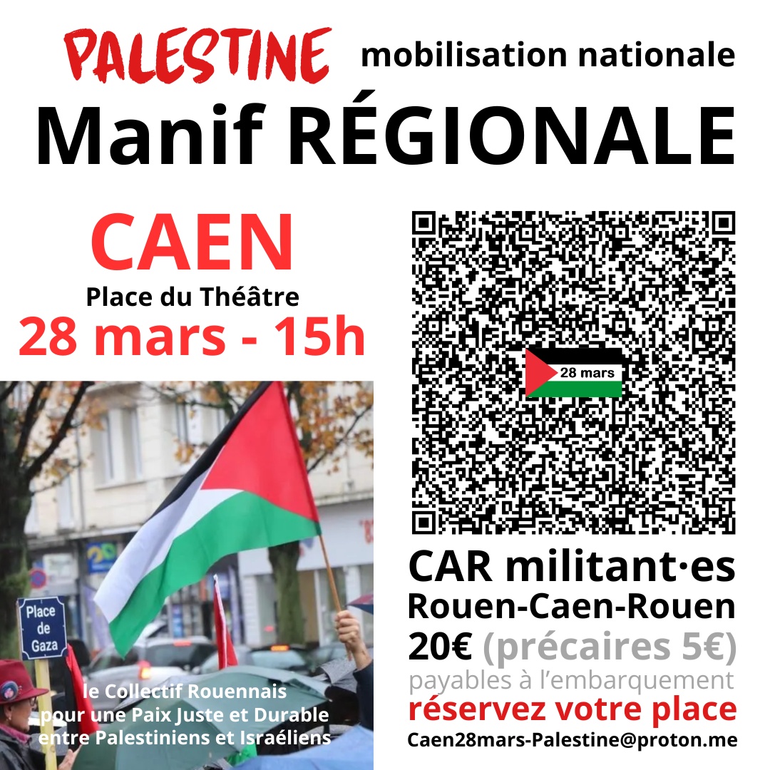 Dans le prolongement de la manifestation à PARIS le 29 novembre, les Collectifs sont appelés à manifester dans toutes les régions. C'est à CAEN que la Normandie se regroupera samedi 28 mars. Réservez votre place dans le car par mail Caen28mars-Palestine@proton.me